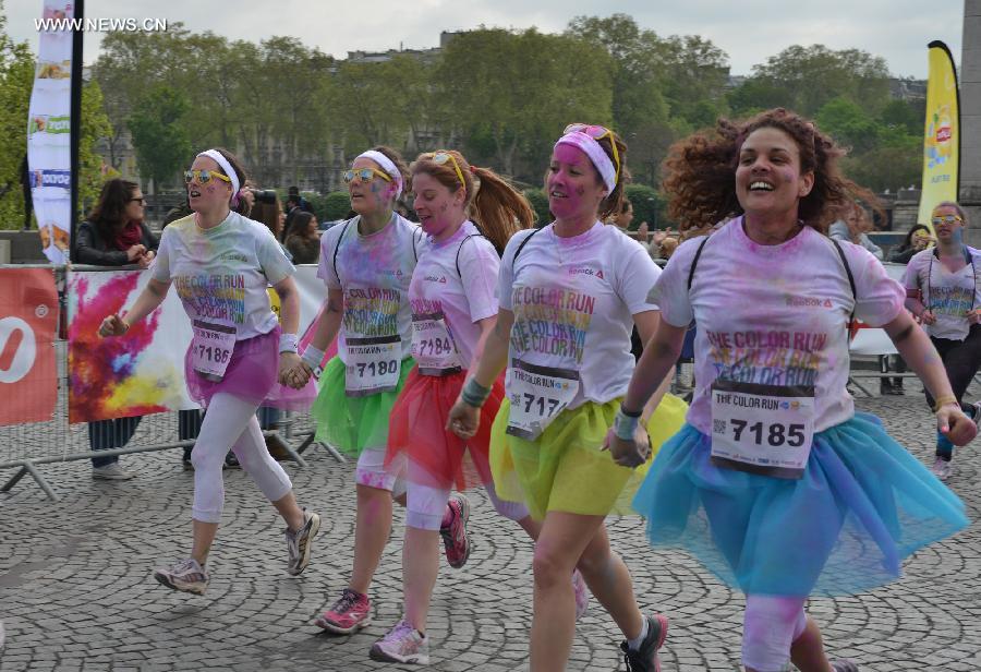 Runners covered in coloured powder take part in the 5-kilometer Color Run race in Paris, capital of France, on April 13, 2014. (Xinhua/Li Genxing)