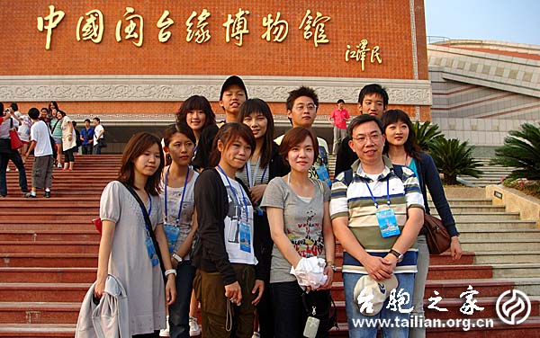 臺胞之家網訊:7月9日,來自臺灣28所大學、8個國家與地區的93名臺胞大學生組成的“海峽西岸2009年臺胞青年夏令營”的營員抵達泉州市,走進了“中國閩臺緣博物館”。   陽光下,雄渾的“閩臺緣博物館”在清源名山和西湖碧水的映襯下,有著不同凡響的獨特魅力。館樓正面那兩道橘紅色的半弧形屋面斜階,宛若一雙張開熱情洋溢的臂膀,歡迎來自海峽東岸的青年朋友們。  走進雄偉壯觀的博物館二樓主題館展廳,首先撲入眼簾的是是那幅火藥爆繪壁畫,看到用火藥爆繪而成的碩大的榕樹以及畫布上時隱時現的百家姓,青年臺胞們被深深吸引住了,紛紛用手中的相機拍下難忘的畫面。