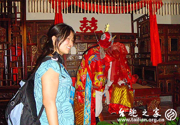 在講解員的帶領下,青年臺胞們沿著大廳兩旁回廊式的展廳移步觀賞。從“遠古家園”、“血脈相親”到“隸屬與共”、“開發同功”,從“文脈相承”、“諸神同祀”到“風俗相通”,營員們從實物、圖片、蠟像、雕塑、聲電光展示中感受歷史、感受海峽兩岸同根同源、密不可分。熟悉、濃鬱的閩南文化氣息和鄉音鄉俗讓臺胞青年們倍感親切,帶隊的老師饒有興趣地說:“閩南地區女孩子出嫁絞面的習俗臺灣也有,只是現在不多了,這可是美容的一種方法呀!”旁邊的臺灣逢甲大學的李永源同學說:“感覺好奇特哦!我祖籍是福建,來到這里,就好像回到了老家的大厝,一樣的建築風格,一樣的閩南語調,一樣的生活場景,我有了一種回家的感覺耶!”。