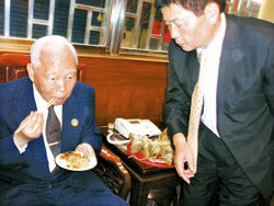顏清標前天獲悉張克輝思念臺灣肉粽,當晚就請家人備料,昨天起大清早,親自替張克輝準備五花肉、香菇、冬蝦和蘿卜幹等材料包裹的傳統家鄉味肉粽,在張向媽祖上香後,拿出來讓他品嘗,張吃得滿口留香,頻頻說好吃。