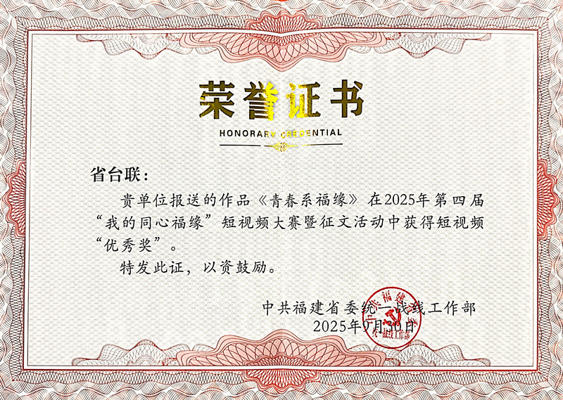 日前,由福建省委統戰部主辦的第四屆“我的同心福緣”短視頻大賽暨徵文活動評選結果公布,福建省臺聯報送的短視頻《青春係福緣》獲“優秀獎”。