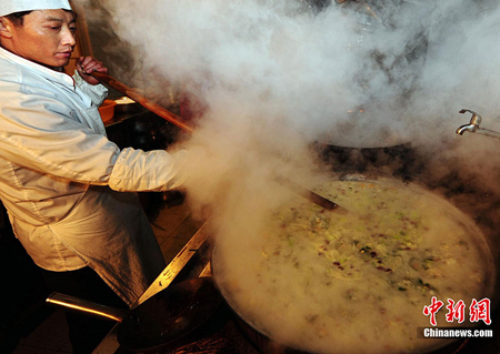 1月10日晚,揚州大明寺工作人員連夜熬制120大鍋“臘八粥”。11日是農歷十二月初八,俗稱“臘八節”,民間有吃“臘八粥”的習俗。熬煮以糯米為主料,配有蓮子、桂圓、紅棗、花生等18種輔料做成的“臘八粥”,寓意平安、吉祥、增壽。孟德龍 攝