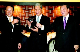 臺灣貿易協會昨晚宴請赴臺大陸採購團,臺灣方面熱情招待李水林(中)一行。(圖片來源:聯合報)
