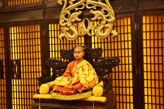 下午五點,北京紅劇場內《功夫傳奇》下午場演出即將開始,觀眾陸續進場。演出大廳門口,一個小和尚正在坐禪,手執木魚,念念有詞。這是《功夫傳奇》極具特色的迎賓儀式,也是中國功夫注重“禪武雙修”的最直觀表現。前來看演出的觀眾們興致勃勃地與小和尚合影留念。
