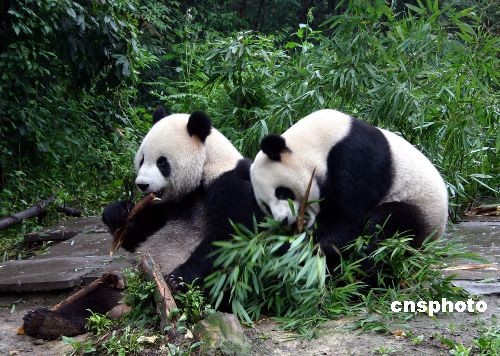 資料圖: 兩只贈臺大熊貓“團團”和“圓圓”,圖為“圓圓”正在吃從“團團”手中搶來的竹筍。 中新社發 黃永莉 攝