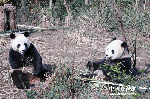 12月11日下午,“團團”、“圓圓”在雅安碧峰峽大熊貓飼養基地內開心進食。(鐘寶華 攝)