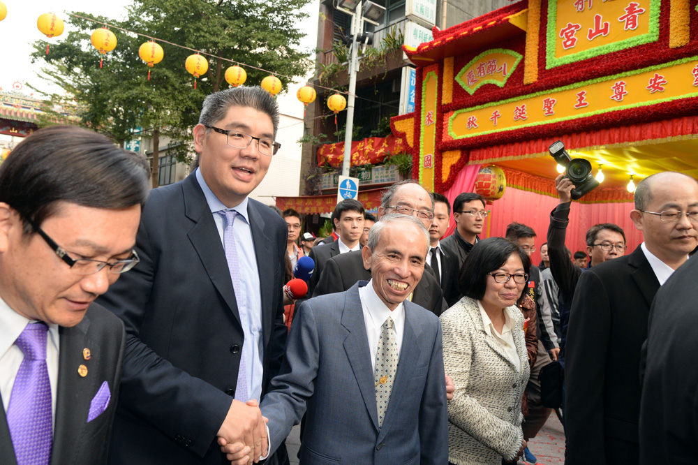 國民黨中央委員連勝文(左二)日前出席艋舺青山宮靈安尊王聖誕慶典遶境活動,雖然緊握每一雙支持者的手,但仍不願表態是否參選臺北市長 圖/“中央社”