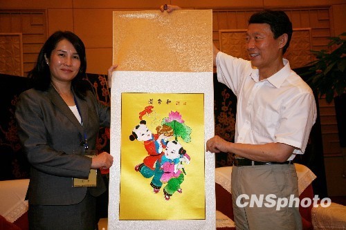 7月6日,臺灣少數民族民意代表高金素梅率團抵達四川參訪,參訪團由109名臺灣“8.8”風災災區少數民族民眾組成,參訪團將赴四川部分地震災區重建點借鑒重建經驗。四川省委副書記李崇禧在成都接見了高金素梅,並向高金素梅贈送了出自地震重災區綿竹的手工年畫。圖為臺灣少數民族民意代表高金素梅(左)受贈四川省委副書記李崇禧(右)綿竹年畫。圖片來源:中新社