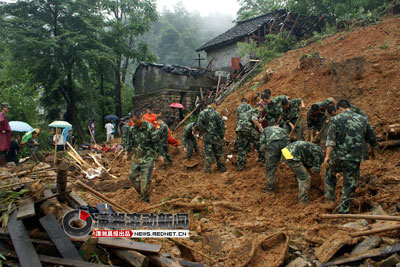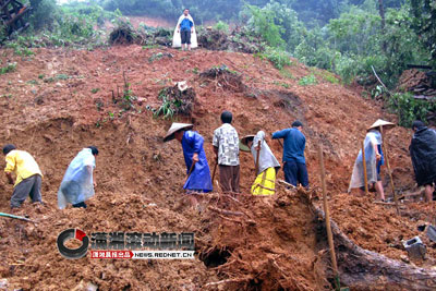 由于通往事發現場的道路被水衝斷,導致大型挖掘機械短時間內無法達到現場,現場一度採用人工挖掘。12日下午3點左右,3名遇難村民被挖出。到下午5點多,當地政府緊急調運一臺大型挖機趕到現場進行挖掘。13日早上8點20分左右,另外3名遇難者遺體也被找到。