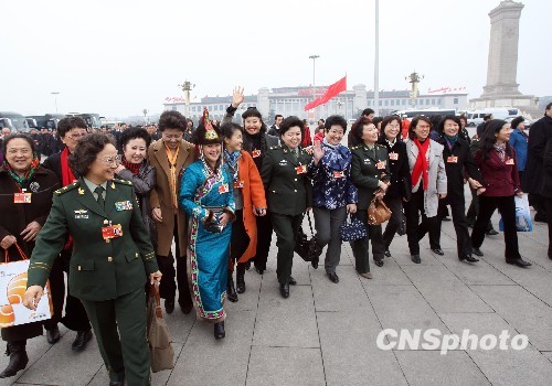 資料圖片:在“三八”婦女節即將來臨之際,全國政協十一屆三次會議第二次全體會議3月7日在人民大會堂舉行。出席會議的女委員們紛紛接到男委員們提前送來的節日祝福,臉上洋溢著節日的喜悅。 (中新社發 湯彥俊 攝)