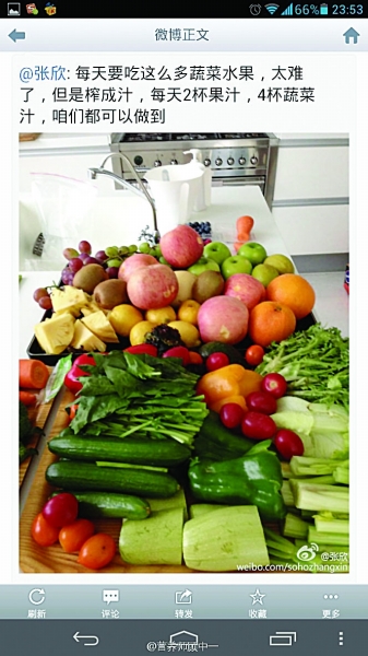 @張欣(潘石屹妻子):每天吃這麼多水果蔬菜太難,但是榨成汁,每天2杯果汁,4杯蔬菜汁,咱們都可以做到。