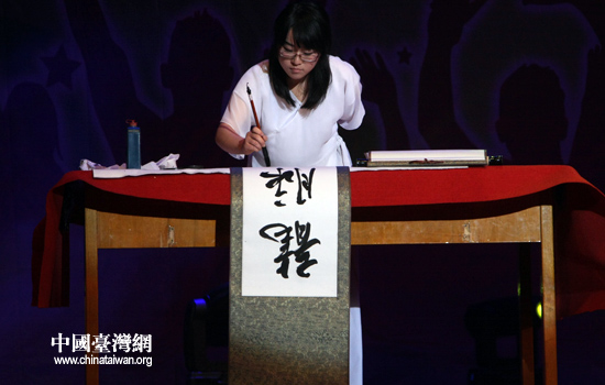 6日,全國臺聯2010年臺胞青年千人夏令營在北京舉行開營儀式。圖為北京高校青年現場書寫夏令營主題:龍脈相傳,青春中華。(中國臺灣網 張弛 攝)
