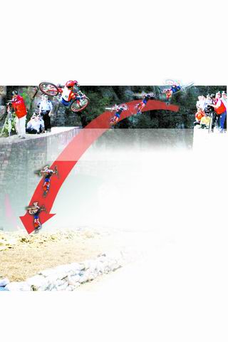起始速度為零,沿著69米長的下坡,王會海的自行車下行。沒有蹬車的動作,完全靠跑道的“助力”,王會海駕車沿著跑道中軸線加速前行。到達跑道轉折點,車頭上揚,自行車軌跡由下降轉為上升。撞擊木板的響聲剛傳到觀眾的耳朵,王會海的“戰車”已到達了起飛點。