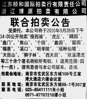 “焦山”、“瘦西湖”、“虎丘”、“明孝陵”……杭州一家公司搶注以30多個著名景點為名的商標,並且本月28日下午,江蘇頤和國際拍賣行有限責任公司和浙江博源拍賣有限公司,將在南京聯手拍賣。但讓人頗感驚訝的是,記者昨天聯係了這些景點,居然鮮有知道自家景點被別人搶注成商標同時即將被公開拍賣的!