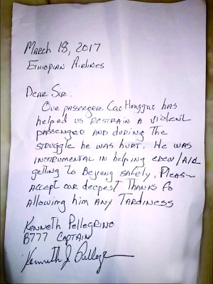 昨日,一則“萬米高空見義勇為”的消息刷遍了社交網絡,3月18日埃塞俄比亞航空公司從埃塞俄比亞首都亞的斯亞貝巴飛往北京的ET604次航班上,有人突然衝擊駕駛艙,當時正在飛機上的中國乘客曹紅國挺身而出,和機組人員及另外兩名乘客一同將其制服。隨後,飛機安全迫降巴基斯坦拉哈爾機場,曹紅國之舉也獲得機長的稱讚,並寫了一封信表示感謝(右圖)。阿里巴巴天天正能量決定聯合北京晨報,獎勵曹紅國10000元正能量獎金。