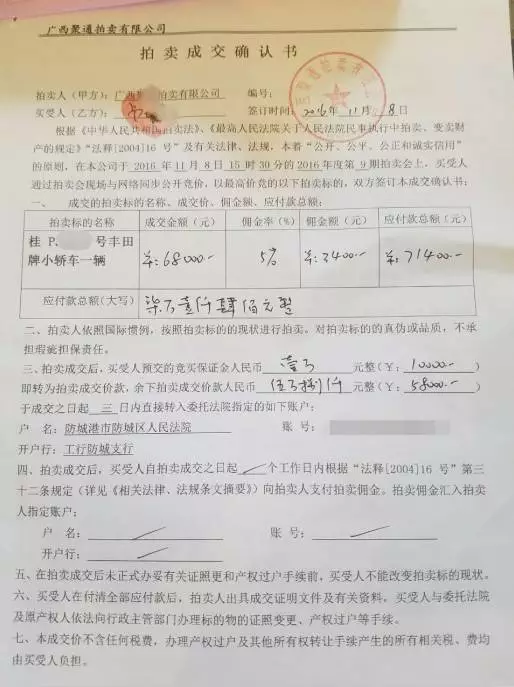 2016年11月8日,南寧盧先生參與防城區人民法院組織的一起司法拍賣,以7.14萬元(成交價6.8萬元,拍賣傭金3400元)的價格,競拍到一輛黑色豐田牌皇冠轎車。