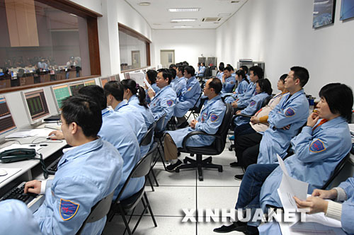 11月7日,北京航天飛行控制中心在實施嫦娥一號 衛星第三次近月制動測控任務時實行重要崗位雙崗制,確保任務順利完成。 新華社 記者田兆運攝