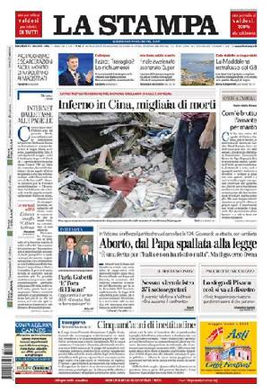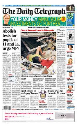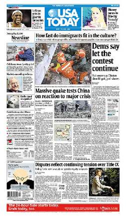 12日發生的中國汶川大地震震驚了全世界。對中國災情的報道13日登上世界各大媒體頭版,地震造成的重大生命損失成了國際媒體關注的焦點。美國《今日美國報》當日在頭版頭條報道稱,“大地震考驗中國重大危機反應”。