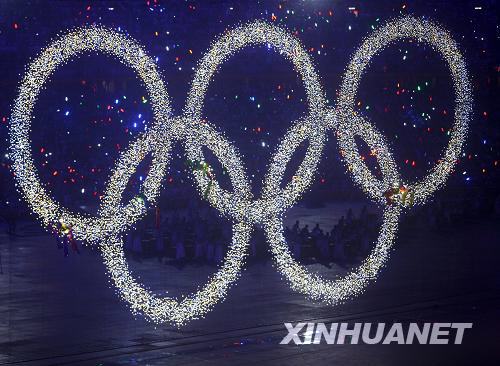 8月8日晚8時,第29屆夏季奧林匹克運動會在國家體育場——“鳥巢”隆重開幕。這是在開幕式上閃閃發光的夢幻“五環”。新華社記者 邢廣利 攝