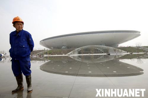 3月31日,位于上海世博會浦東園區、造型呈飛碟狀的世博文化中心正式竣工,一名工人在世博文化中心前留影。據悉,上海世博會將于4月20日啟動試運行,預計園區內七成展館將參加試運行。目前,世博園區建設已臨近尾聲,園區內配套設施基本建成,布展工作正在抓緊進行。新華社發(黃炎 攝)