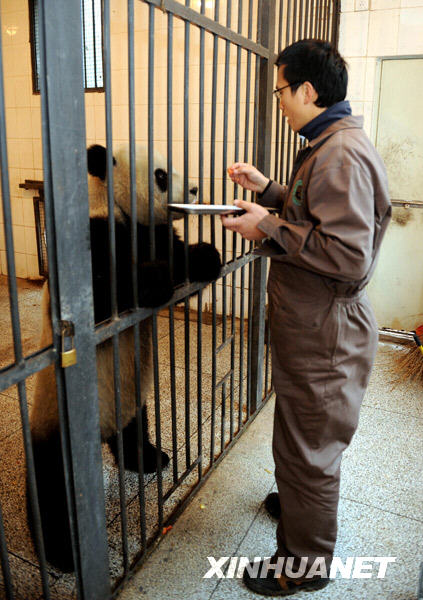 12月21日,臺北木柵動物園飼養員王進治在訓練“團團”。新華社記者陳燮攝