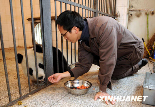 12月21日,臺北木柵動物園飼養員遊雪音在給“圓圓”喂食。新華社記者陳燮攝