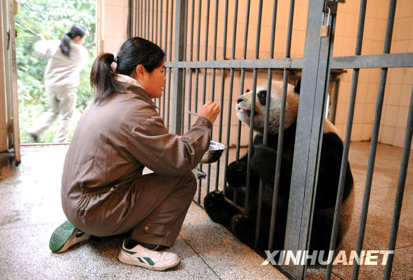 從2008年10月開始,臺北木柵動物園的3名飼養員分兩批來到中國保護大熊貓研究中心四川雅安碧峰峽基地,學習大熊貓飼養技術。目前,他們和贈臺大熊貓“團團”“圓圓”已經建立感情,基本掌握了大熊貓飼養技術。新華社記者陳燮攝