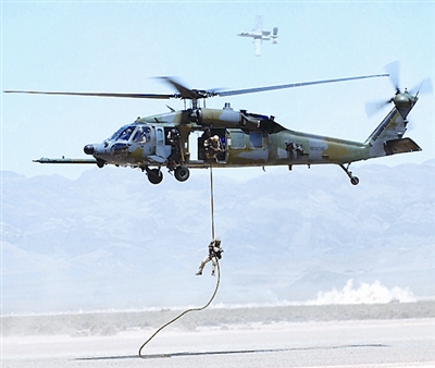 “黑鷹”直升機是美軍普遍使用的一種武裝直升機,從美國西科斯基公司生產的雙渦輪軸引擎、單旋翼直升機S-70型發展而來的一種中型通用/攻擊直升機。除1名駕駛員外,機上可搭載11名士兵,主要執行向前沿陣地運送突擊部隊和對地面目標進行攻擊的任務。