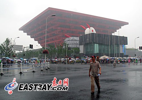6月29日上午11時左右,一位男遊客不打傘走在雨中,身後的中國館下人頭攢動