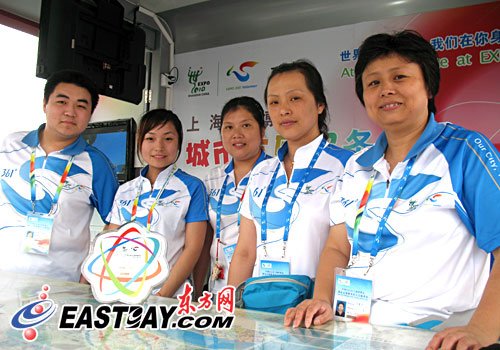 左起:6號門志願者站的當班志願者劉陽林、梁紅、錢敏秀、陳慧華、汪愛華