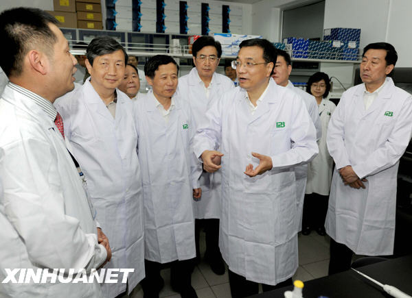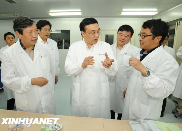 5月29日,中共中央政治局常委、國務院副總理李克強到中國醫學科學院和北京科興生物制品有限公司考察甲型H1N1流感防控工作,對聯防聯控工作作進一步部署。這是李克強考察北京科興生物制品有限公司,了解疫苗和藥品研制生產情況。新華社記者 馬佔成 攝