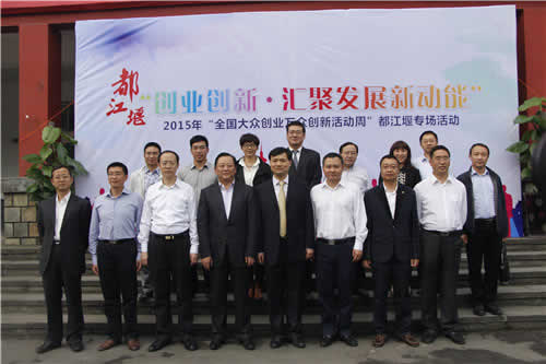 都江堰市委副書記、市長何維楷和成都東軟學院黨委書記、院長張應輝及學院3位創業學生代表一同為2015年“全國大眾創業萬眾創新活動周”都江堰專場活動揭開序幕