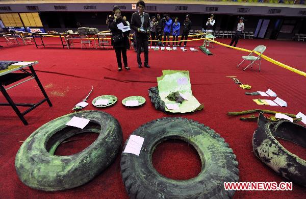 Found objectives are seen kept in a gymnasium in Ilan, southeast China's Taiwan, Oct. 28, 2010. Rescuers found victims' belongs and remaining parts of the bus one after another and transferred them to Ilan for further identification. Twenty-one members of a tour group -- 19 mainland tourists from south China's Guangdong province, a local guide and a local driver -- are still missing after their bus was hit by a Typhoon Megi-triggered landslide on Oct. 21, 2010. (Xinhua/He Junchang) |