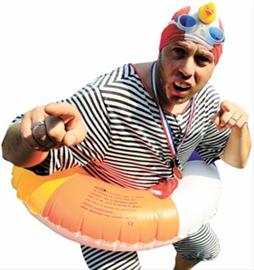 British comedian Fran, who wears a swimming cap, a zebra suit and a floatation ring around his waist, can unexpectedly appear behind you at anytime. How can he not steal the spotlight?