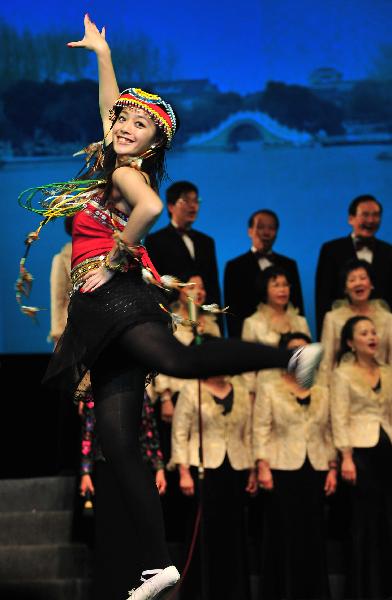 A sylph dancer of the Taiwan Ami aboriginal dance to the tune airily, during a large entertainment soiree on title of Sentiment Across the Taiwan Straits, in the Grand Theater of Yangzhou, east China's Jiangsu Province, April 11, 2010. Performers from Taiwan and Yangzhou City join hand to present a cracking musical pageant consisting of 3 chapters, namely Sounds from Treasure Island, Mellifluous Musical Rhyme of Guangling, Profound Sentiment Across Taiwan Straits, etc. (Xinhua/Wang Zhuo) |