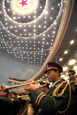The military band play Chinese national anthem during the closing meeting of the Fourth Session of the Tenth National Committee of the Chinese People's Political Consultative Conference (CPPCC) at the Great Hall of the People in Beijing March 13, 2006. [Xinhua Photo]