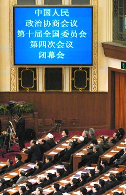 The Fourth Session of the Tenth National Committee of the Chinese People's Political Consultative Conference (CPPCC) hold the closing meeting at the Great Hall of the People in Beijing March 13, 2006. [Xinhua Photo]