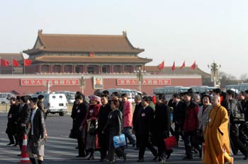 Members of the Tenth National Committee of the Chinese People's Political Consultative Conference (CPPCC) walk to the Great Hall of the People in Beijing March 13, 2006. [Xinhua Photo]