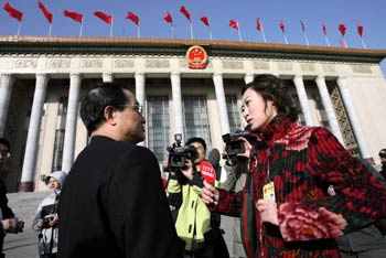 A member of the Tenth National Committee of the Chinese People's Political Consultative Conference (CPPCC) speaks to a reporter outside the Great Hall of the People in Beijing March 13, 2006. [Xinhua Photo]