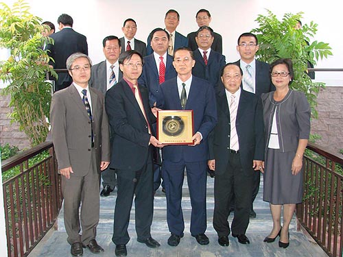 楊啟秋會長(前排中)和傅鐵生副秘書長互送紀念品。(圖:柬埔寨星洲日報)