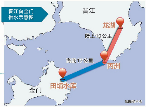 福建向金門供水工程水源取自泉州市晉江流域,由晉江金雞攔河閘引水至晉江市龍湖水庫,經龍湖抽水泵站抽水輸水至圍頭入海點,再經海底管道輸送至金門,輸水線路總長27.56公里,其中福建方面陸地管道11.6公里、海底管道15.76公里,金門方面陸地管道0.2公里,工程總投資3.878億元。福建方面負責龍湖取水泵站、龍湖水庫至丙洲入海點的供水設施建設,金門方面負責從丙洲入海點至田埔水庫的購水設施建設,即海底管線由金門方全段出資、建設和營運。工程設計日供水規模3.4萬立方米,通水後,福建將按計劃每天24小時連續供水。目前,大陸段已完成投資1.1億元,佔大陸段工程總投資的87.8%。