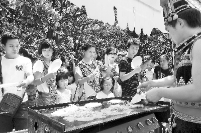 臺灣美食“蚵仔煎”小吃吸引眾多遊客排隊品嘗。近日“二○一○貴陽—臺北美食風情節”開幕。這是貴陽市首次與臺灣旅遊業界攜手共同舉辦的一次旅遊、餐飲、娛樂盛會,以“兩岸牽手、共饗鄉情”為主題,突出體現貴陽、臺北兩地飲食文化氛圍、積極倡導健康飲食理念。追 影 攝