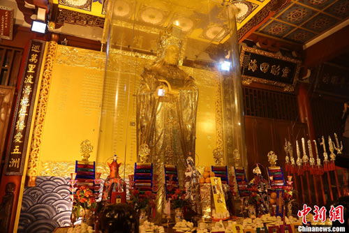 由兩岸專家共同鑄造的全球最大黃金媽祖像,11日在“媽祖故里”福建莆田湄洲島上的湄洲祖廟順濟殿開光。包括百家臺灣宮廟在內的兩岸近千家媽祖宮廟3000余名信眾,齊聚湄洲島共同禮拜媽祖。
