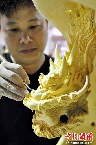 6月15日,來自臺灣的木雕高手官小欽在中國木雕現場創作大賽現場對作品《蛻變》中的一條龍進行雕琢。6月6日至16日,第二屆中國木雕現場創作大賽在福建省莆田市舉行,來自臺灣、福建、山西、浙江、江西等地的25名木雕高手參加了比賽,現場創作最優秀作品將獲得“獎元獎”。 林劍冰 攝