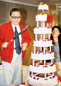 李敖開心切7層蛋糕,昨天出書又慶生,意義重大。圖片來源:臺灣《中國時報》