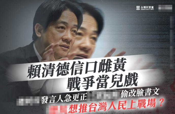 臺灣民眾黨批評賴清德推人民上戰場。(圖片取自網絡)