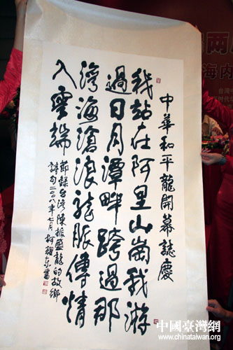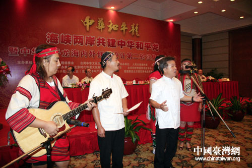 在儀式上,不僅人首龍身的“中華和平龍”雕塑露出廬山真面目,陳振盛團隊為雕塑創作的一件書法作品和《遙望龍的故鄉》主題歌也首次亮相,來自南投的原住民表演者用民族化的曲調烘托情真意切的歌詞,訴說出龍的子孫對故鄉的殷殷深情。