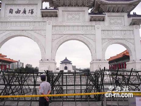 中正紀念堂牌樓上的自由廣場四個大字,馬當局還沒打算卸下。(中評社李仲維攝)