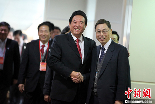 應臺灣海基會董事長江丙坤之邀,海峽兩岸關係協會會長陳雲林率海協會經貿考察團搭乘CA185班機,于2月23日中午抵臺。圖為陳雲林與到桃園機場迎接的海基會副董事長高孔廉親切握手。