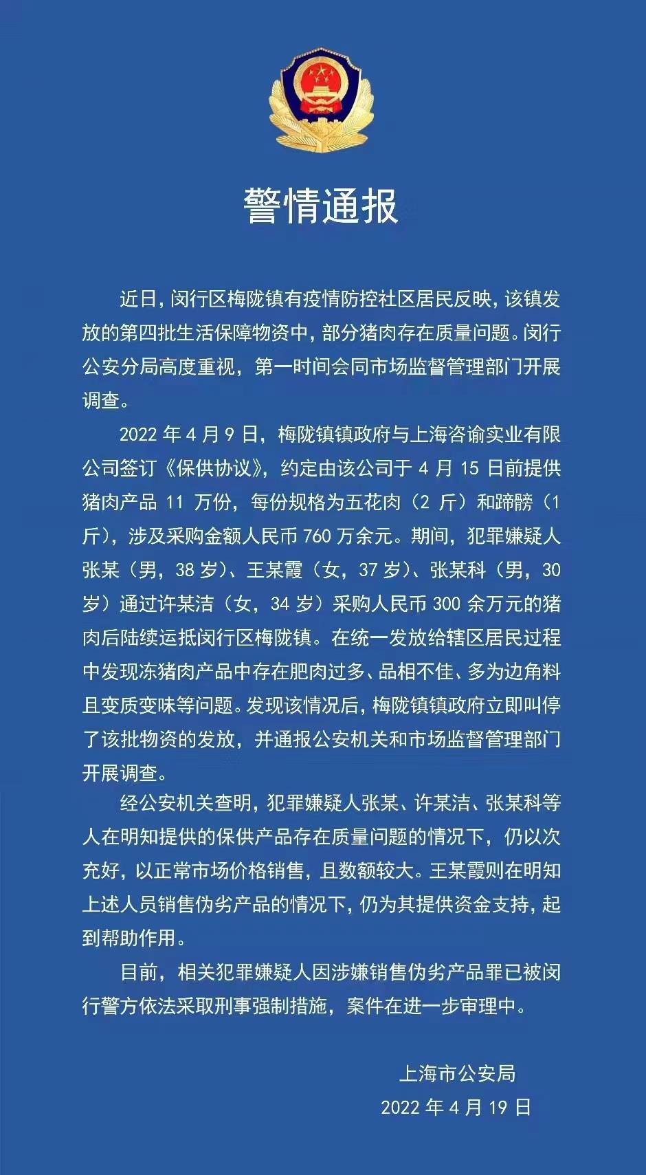警方通報:2022年4月9日,梅隴鎮鎮政府與上海咨諭實業有限公司簽訂《保供協議》,約定由該公司于4月15日前提供豬肉產品11萬份,每份規格為五花肉(2斤)和蹄鏣(1斤),涉及採購金額人民幣760萬余元。其間,犯罪嫌疑人張某(男,38歲)、王某霞(女,37歲)、張某科(男,30歲)通過許某潔(女,34歲)採購人民幣300余萬元的豬肉後陸續運抵閔行區梅隴鎮。在統一發放給轄區居民過程中發現凍豬肉產品中存在肥肉過多、品相不佳、多為邊角料且變質變味等問題。發現該情況後,梅隴鎮鎮政府立即叫停了該批物資的發放,並通報公安機關和市場監督管理部門開展調查。